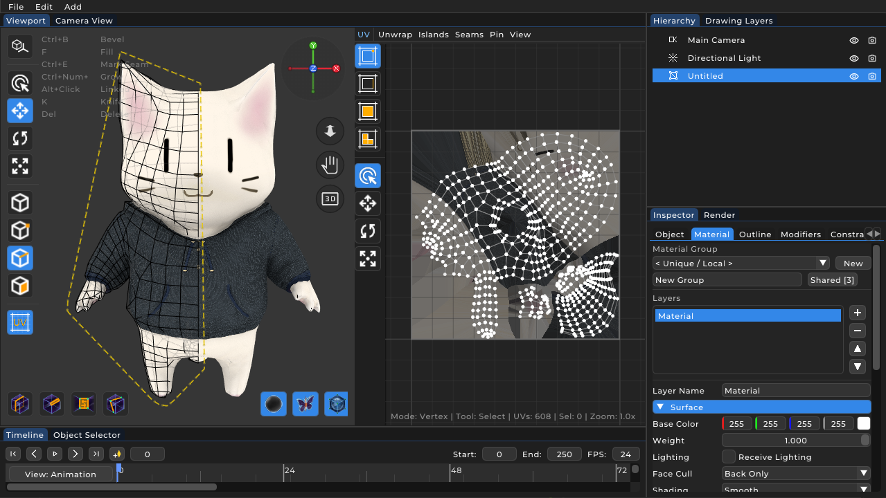 Despite being lightweight, PapaiArt Animation Studio does not compromise on professional 3D functionality. A clean hierarchy panel and a robust modifier system (including Mirror and Subdivision Surface) enable non-destructive 3D modeling. Furthermore, character rigging is supported by advanced built-in constraints such as Inverse Kinematics (IK), TrackTo, and ChildOf. This level of rigging power is practically unprecedented for an animation package of this compact size.